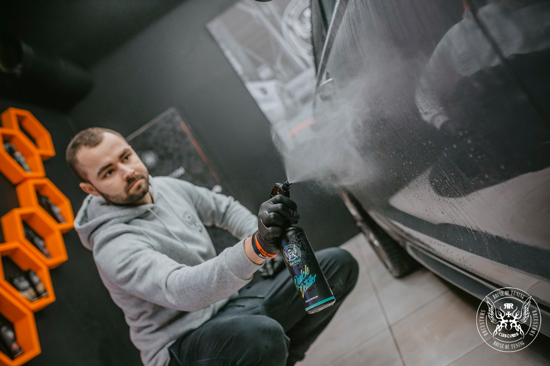 - Aplicación en húmedo de Quick Detailer: pulverizar unos 20 ml de producto sobre la pintura después del lavado, aclarar el exceso y secar la superficie con una toalla; ¡no dejar secar!